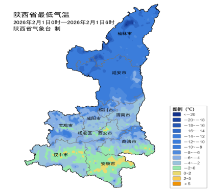 具体分布:陕北-21~-4℃,最低神木市大保当镇摆言采站-21.1℃;关中-13~2℃,最低长安光头山站-12.7℃,西安站-0.4℃;陕南-10~3℃,最低宁陕胭脂坝站-10.1℃。