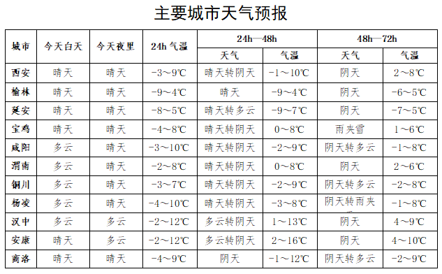 3日:全省阴天。关中部分地方、陕南中西部部分地方有雨夹雪或小雨,关中西部及北部局地、秦巴山区局地有小雪。